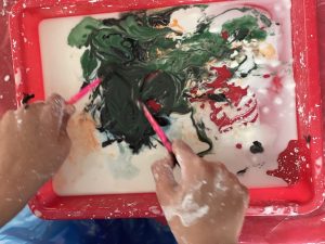 Creative sensory activities such as working with cornflour and paint can help clients to regulate their bodies and minds so that they are able to either access language or express thoughts and feelings through colour, movement, shape and metaphor. I have been inspired by therapeutic story telling techniques to help support my young, teenage and sometimes older, clients to express and process disturbing thoughts without triggering them in a way that they need to withdraw from sessions (Using Story Telling as a Therapeutic Tool- Magot Sunderland).
